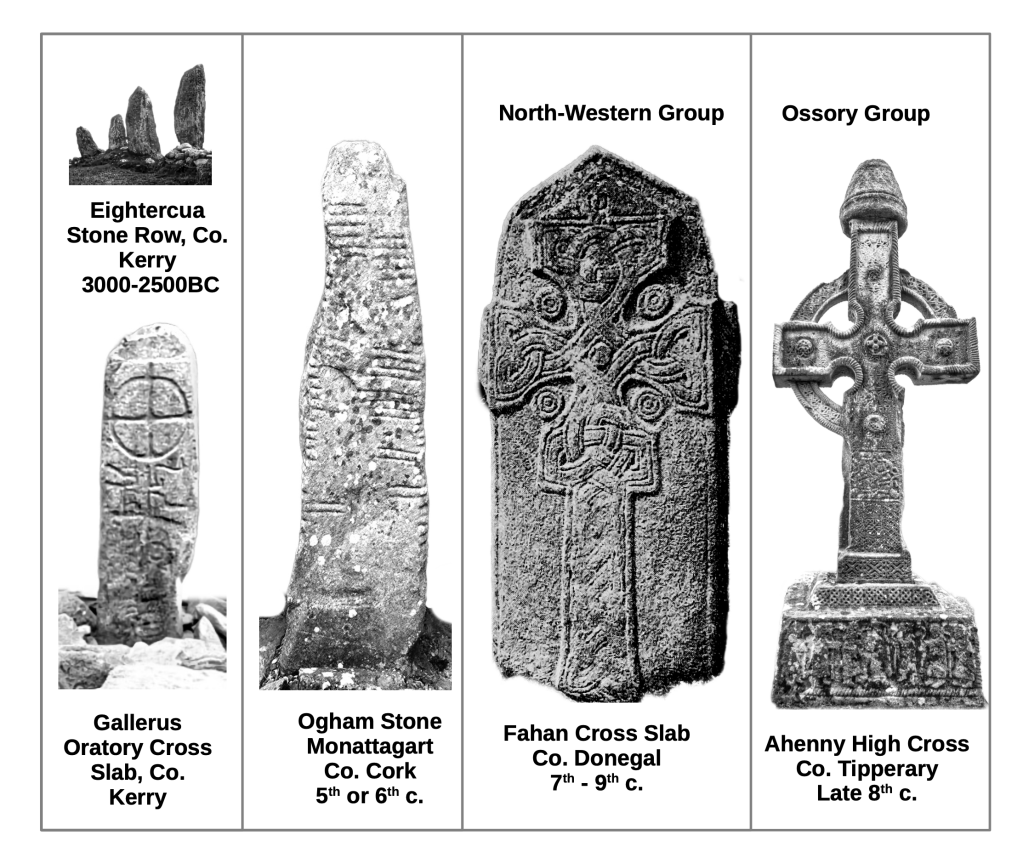 Figure 2: Eightercua (Niall Huggard), Gallerus Standing Stone (Philip Halling), Ogham Stone (author), Fabian Cross Slab (Internet Archive Book Images), Ahenny High Cross (Maureen Maher)