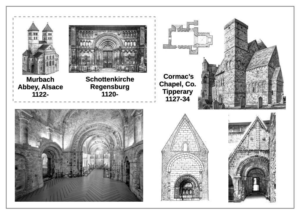 Cormac’s Chapel, built in the 12th century at Cashel, is Ireland’s only fully realized Romanesque church. In keeping with continental prototypes, it includes two flanking towers, a chancel extension, barrel vaulting, richly decorated archivolts, and rows of arcades both inside and out. Its design may reflect influence from churches at Murbach and Regensburg, where Irish monks had ties with German counterparts. Yet unlike continental examples, Cormac’s Chapel remained small in scale, windowless, and without a transept.