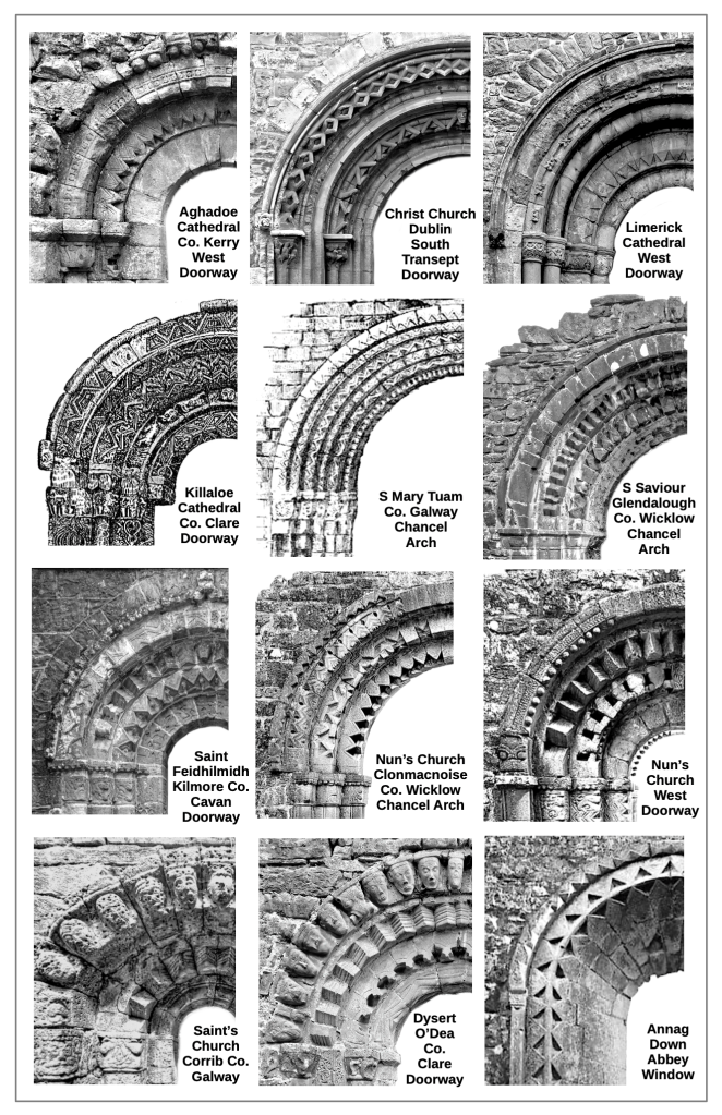 The decoration combined influences from abroad with native traditions. High-relief geometric patterns, such as the bold chevrons at Dysert O’Dea, reflect the influence of Anglo-Norman Romanesque in England. At the same time, flat surfaces were often filled with low-relief carvings—vegetal, geometric, or interlace patterns. This finer work grew directly out of Ireland’s insular art tradition, already seen in the decoration of earlier High Crosses.