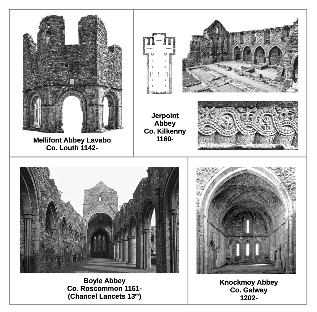 Figure 9: Mellifont (author), Jerpoint 1 (Zairon), floorplan (archiseek.com), frieze (irelandhighlights.com), Boyle (Andreas F. Borchert), Knockmoy (angelfire.com).