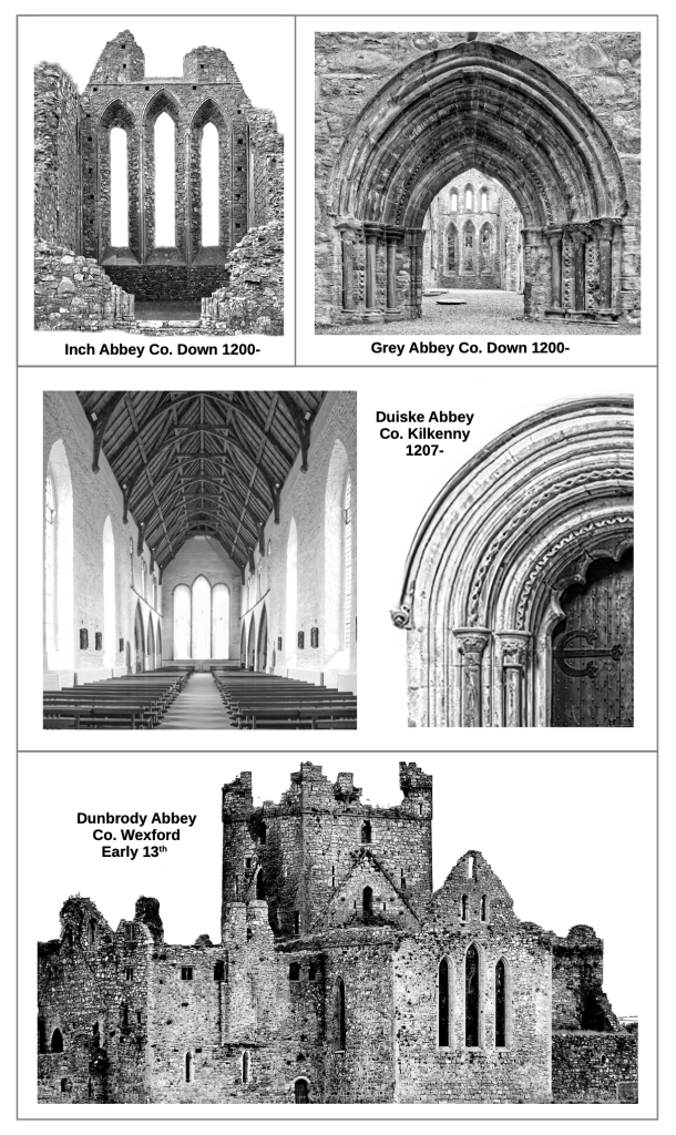 The Anglo-Norman invasion of 1169 ushered in a new phase of Irish church architecture. Norman patrons established their own Cistercian foundations, closely modeled on English examples. Among the earliest are Inch Abbey and Grey Abbey, both founded around the year 1200. These abbeys were the first structures built in a fully Gothic style. Inch Abbey showcases a beautifully executed triple lancet window—an iconic feature of “Early English” Gothic. Lancet windows were soon adopted in monasteries and churches throughout Ireland, remaining in use long after their vogue had faded elsewhere in Europe.