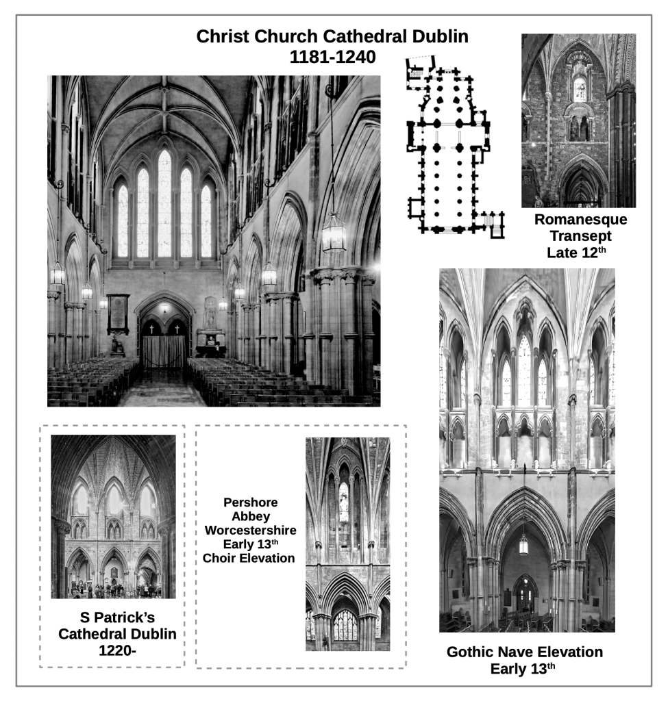 By contrast, the elevation at St. Patrick’s Cathedral is far more typical of the Early English style, with a clearly separated triforium and clerestory. The unusual integration at Christ Church may have arisen from the architects’ attempt to emulate Pershore’s long clerestory windows. Because they also wished to include a triforium, they disguised it within what looks like an extended clerestory zone.