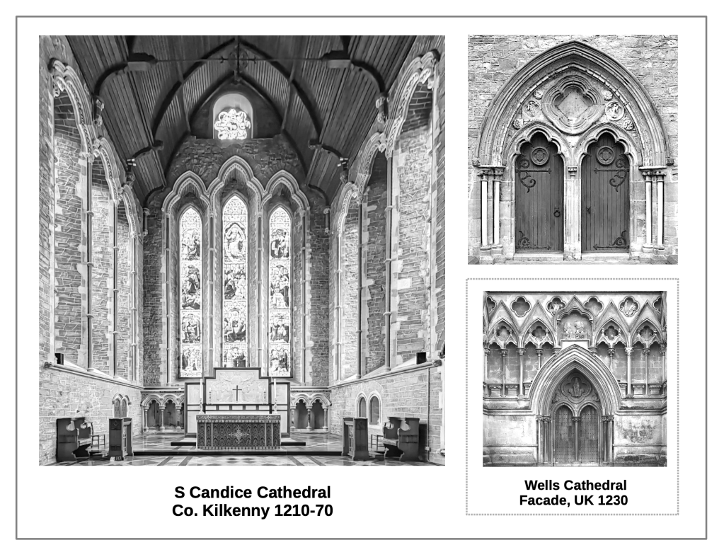 St. Canice’s Cathedral marks the transition from the Early English Gothic style, characterized by simple lancet windows, to the more elaborate Decorated Gothic style, which emphasized geometric groupings of windows. Construction began with the chancel in 1210, featuring a trio of lancets topped with half-quatrefoil motifs.