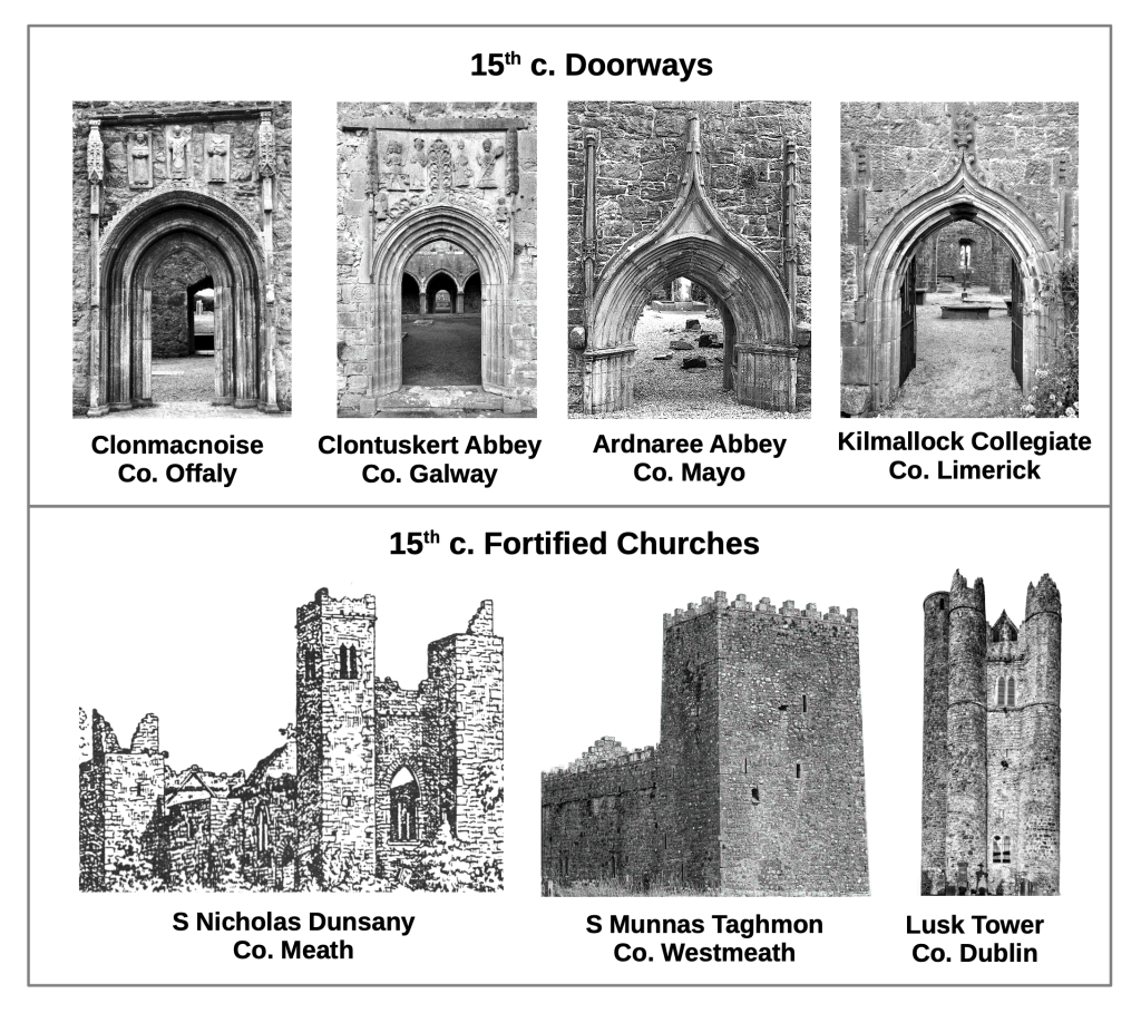 In the 15th century, Irish churches began incorporating ogee-arched doorways, a hallmark of late Gothic design. Some of the most exuberant examples appear at Clonmacnoise and Clontuskert Abbey, where the arches are crowded with sculptural decoration. More restrained versions survive at Ardnaree and Kilmallock, where the ogee arch is presented in its prototypical form.