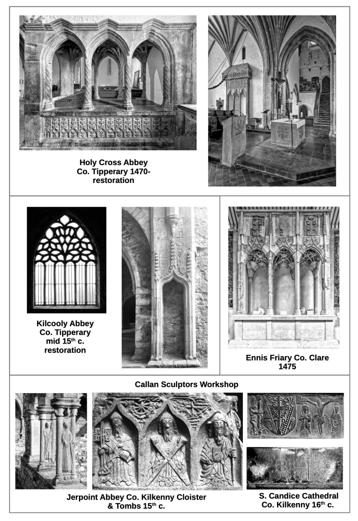 Figure 17: Holy Cross 1 (author), Holy Cross 2 (author), Kilcooly window (Digital Eye), Kilcooly (A.-K.D.), Ennis (author), Jerpoint 1 (Arie M. den toom), Jerpoint 2 (Gerd Eichmann) St. Candice (megalithicireland.com).
