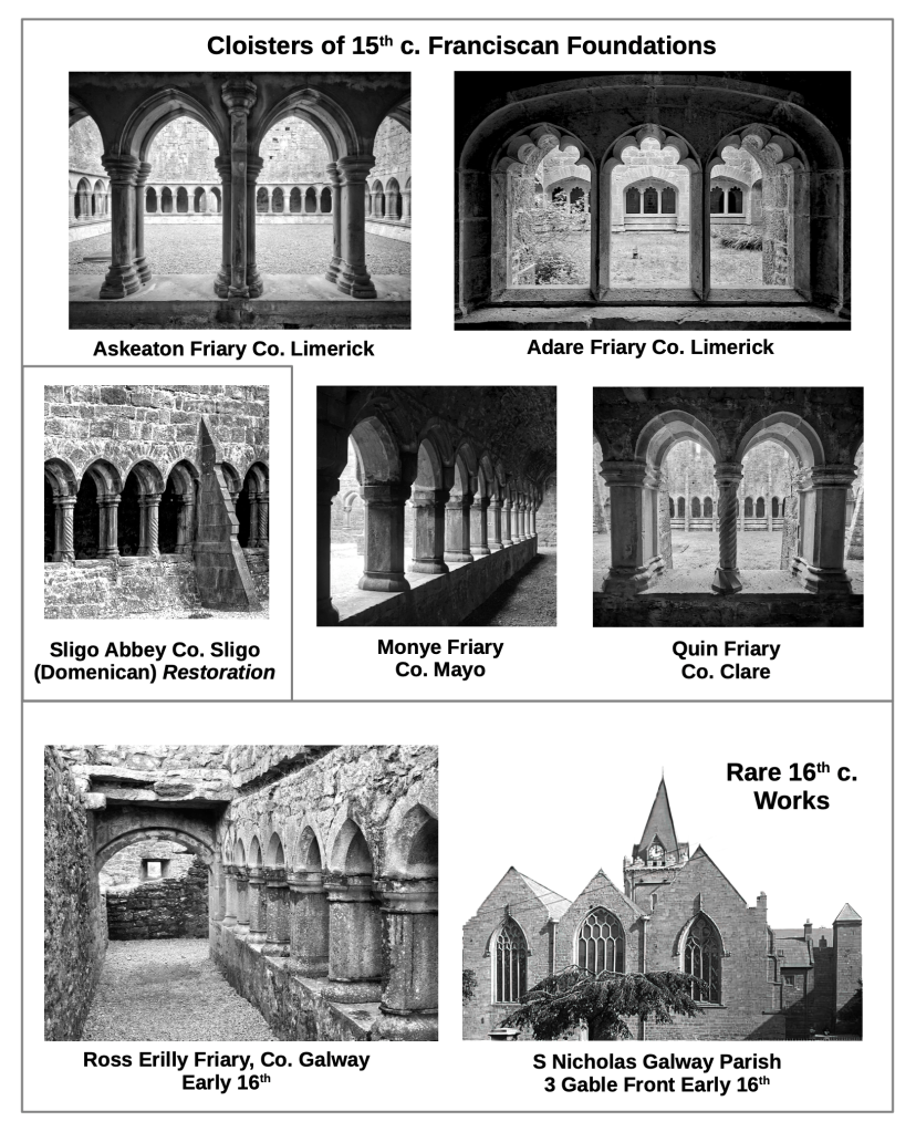 On the eve of the Protestant Reformation, Ireland experienced one final wave of monastic construction. The Franciscan order, enormously popular in the 15th century, admitted both Irish and Anglo-Irish monks and had the wide support of lay communities. The new Franciscan establishments were more modest than the great monasteries of earlier centuries, but they preserve some of the finest cloisters in Ireland. At Sligo and Quinn, the cloisters even include spiral—or Solomonic—columns.