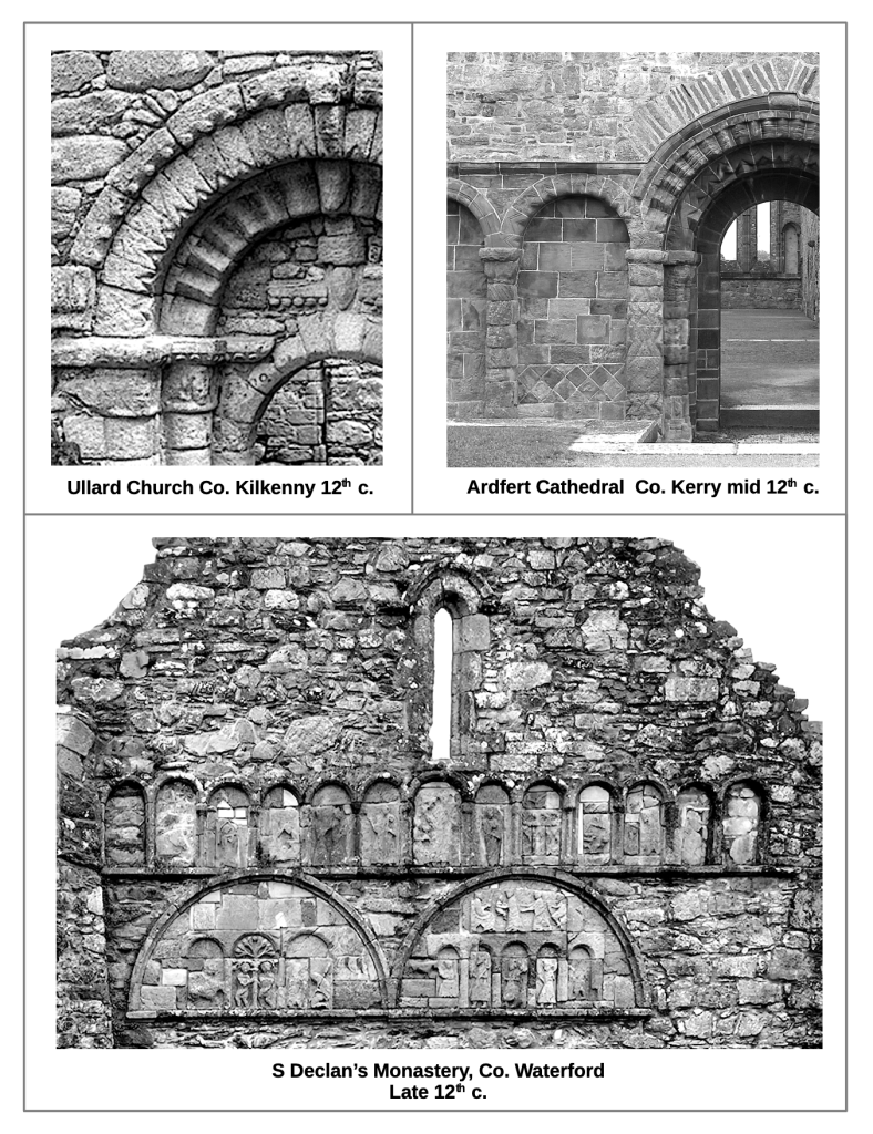 The three churches illustrated above contain unusual iterations of the Romanesque style. Ullard church features a strange lower arch supporting the upper archivolts. Ardfert Cathedral’s west doorway is flanked by an arcade, a rarity in Ireland, though more common in continental Romanesque examples. St. Declan’s monastery contains a strange set of arcades on its west end depicting various figures and events from the Bible.