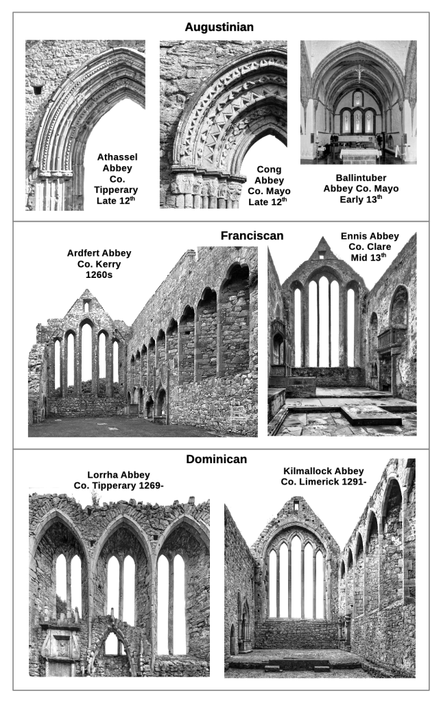 In addition to the Cistercians, Ireland saw the establishment of Augustinian, Franciscan, and Dominican orders in the late 12th and 13th centuries. Unlike the architecturally uniform Cistercians, these groups built monasteries in a range of styles and floor plans. At Athassel Abbey and Cong Abbey, the transitional character of the period is evident in architraves where Romanesque ornament is applied to pointed Gothic arches. Ballintubber Abbey’s chancel, by contrast, closely follows the Cistercian model at Knockmoy. Ballintubber still functions as a parish church today and has preserved much of its medieval character.