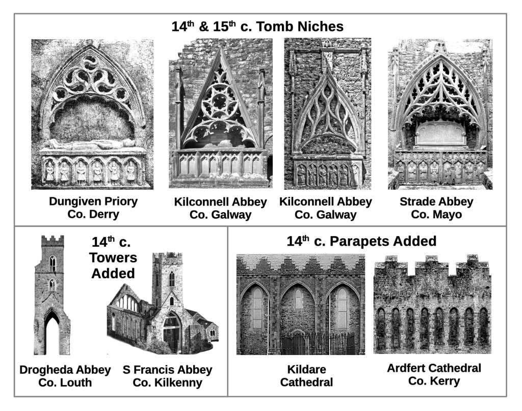 Some of the most striking examples of Irish Gothic tracery survive in 14th- and 15th-century tomb niches. At Dungiven Priory, the niche displays a graceful series of whirling mouchettes, while at Kilconnell Friary one niche uses assertive geometric forms and another adopts the “flamboyant” style, with tracery radiating in flame-like curves. The tomb niche at Strade Abbey combines elements of the geometric Decorated and fluid flamboyant styles.