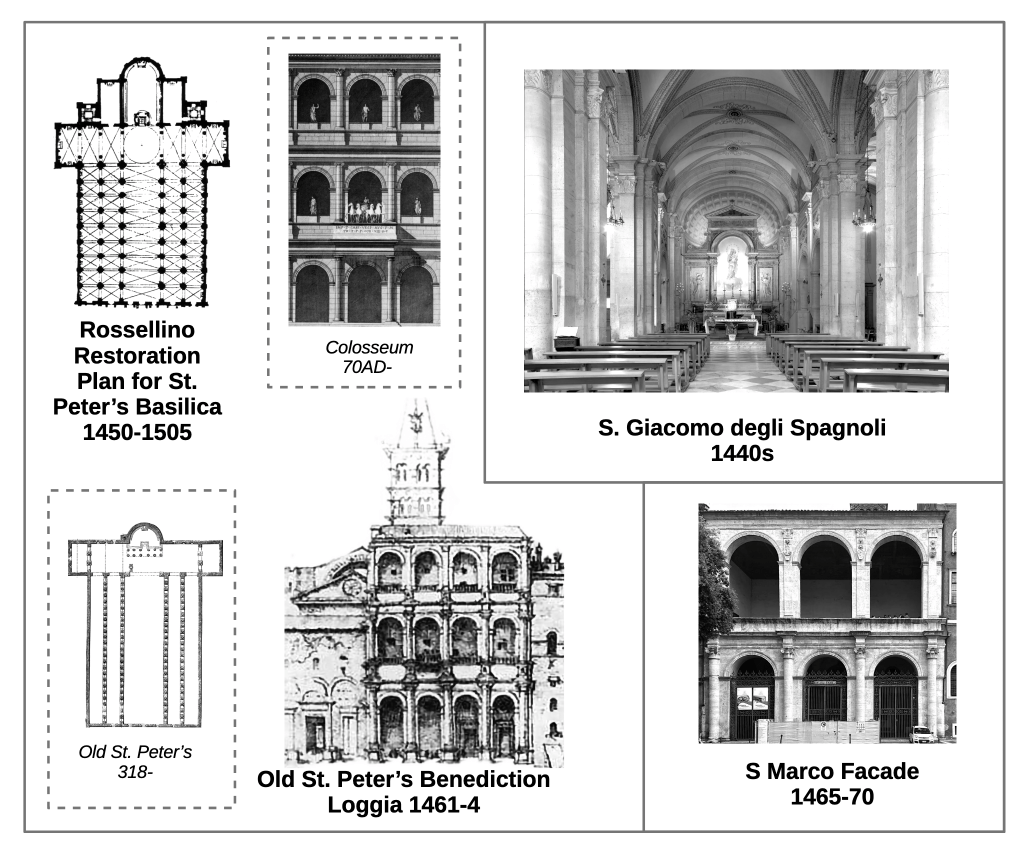 In the 1460s, a Benediction Loggia was erected at the edge of St. Peter’s forecourt, providing a platform from which the pope could address the faithful. Its design drew inspiration from the superimposed classical orders of the Colosseum (c. 75 AD) and the Theatre of Marcellus (13 BC). Although the loggia has been lost along with the old basilica, the surviving façade of San Marco (1465–) displays a similar arrangement of stacked arcades which seems to have been modeled on the Benediction Loggia. Here, Roman architecture begins to re-engage consciously with its own antiquity, marking a shift from classicizing Gothic to deliberate antique revivalism.