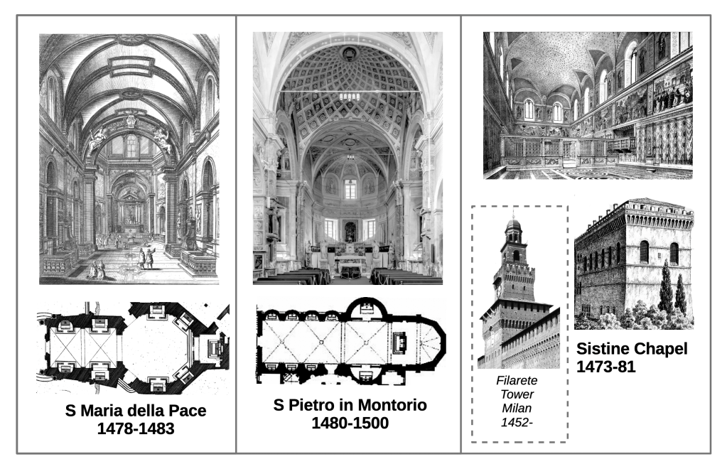 The Sistine Chapel, by contrast, adopts a simple rectangular plan dictated by its function as a venue for papal and clerical assemblies rather than for public worship. Its brickwork closely resembles that of the contemporary Filarete Tower in Milan (1542–).