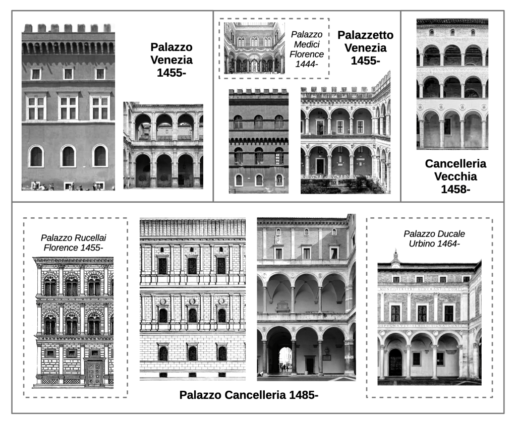 The courtyard of Palazzo Venezia employs arcades with attached columns as at St. Peter’s Benediction Loggia and the façade of San Marco (figure 2), both ultimately modeled on the elevation of the Colosseum. The courtyard of the adjoining Palazzetto features an arcade similar to that of the Palazzo Medici in Florence (1444–), but with reinforced corner columns that emphasize the shape of the overall courtyard—unlike the Medici Palace, which has undifferentiated, single columns at the corners.