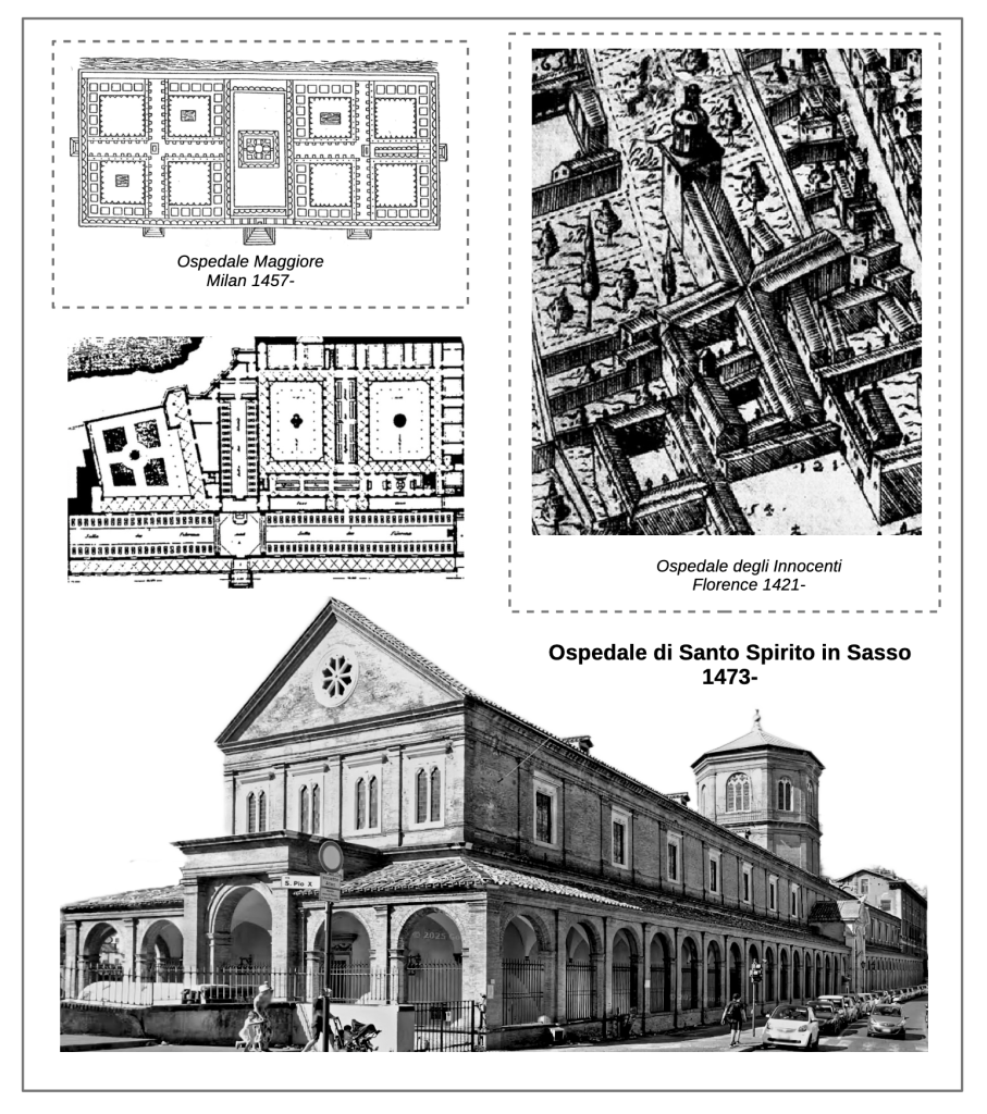 The last major architectural work of the fifteenth century in Rome was the Ospedale di Santo Spirito in Sassia (begun 1473). The complex consists of three wards arranged as long halls radiating around a central, octagonal tower. This plan represents a variation on the cross-shaped layout first introduced in Florence with Brunelleschi’s Ospedale degli Innocenti (begun 1421) and later expanded by Filarete in the double-cross plan of Milan’s Ospedale Maggiore (begun 1457). Filarete’s widely read architectural treatise further disseminated his ideas, strongly influencing subsequent hospital design, including this Roman hospital. Its octagonal tower is also Lombard motif, as seen at the Duomo di Pavia (1488), suggesting a further link between Milanese architectural practice and the hospital’s design in Rome.