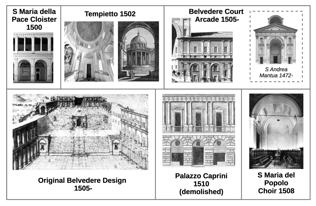 Bramante’s Belvedere Palace at the Vatican (1505-) has been so extensively altered that little of his original conception remains. Nonetheless, the elevation at the east end of the upper courtyard preserves his design. Its triumphal-arch motif, first introduced to Renaissance architecture by Alberti in Sant’Andrea, Mantua (1472-), and its monumental exedra are original to Bramante, although modified by later architects.