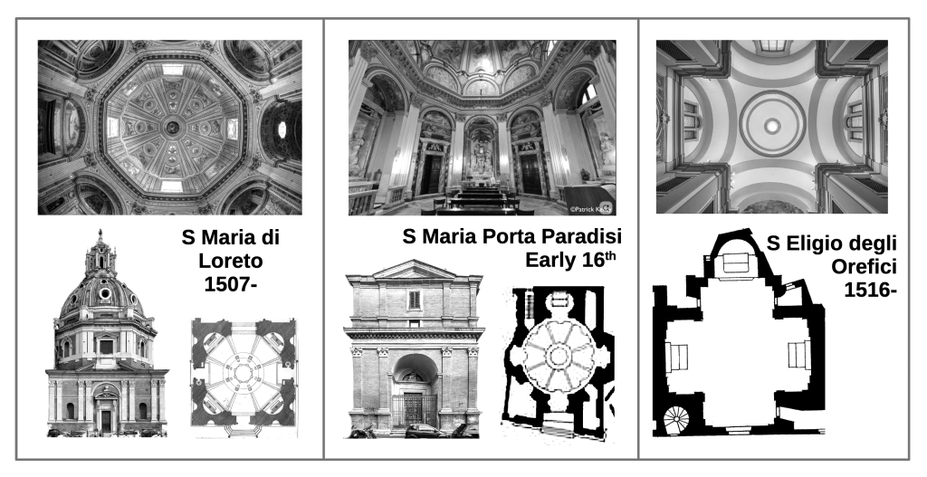 Apart from the great works of Bramante and Raphael, a number of smaller churches were built in Rome during the early sixteenth century, though they have not survived in their original form. The three discussed here reflect the period’s strong preference for centralized plans. Santa Maria di Loreto (begun 1507) and Santa Maria Porta Paradisi (early 16th century) both feature straightforward octagonal domes, inspired by Santa Maria della Pace (1478; see figure 3). Sant’Eligio degli Orefici (begun 1516) introduces a Greek-cross plan with very short arms—a design that became a prototype for many private family chapels later in the century.
