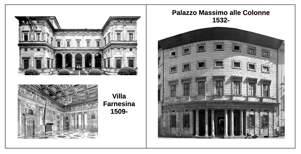 Another great Renaissance painter, Baldassare Peruzzi, made two major contributions to Roman architecture in the early sixteenth century: the Villa Farnesina (1509-) and the Palazzo Massimo alle Colonne (1532-). The Villa Farnesina became the prototype for the U-shaped suburban villa, which replaces the traditional inner courtyard with a rear loggia opening directly onto a garden. This model spread throughout Europe through Sebastiano Serlio’s mid-sixteenth-century architectural treatises, which illustrated plans closely resembling that of the Farnesina. The villa’s façade abandons the double-columned arrangement popular in contemporary palazzi and returns to the single-pilaster divisions of Alberti’s Palazzo Rucellai (see figure 4).