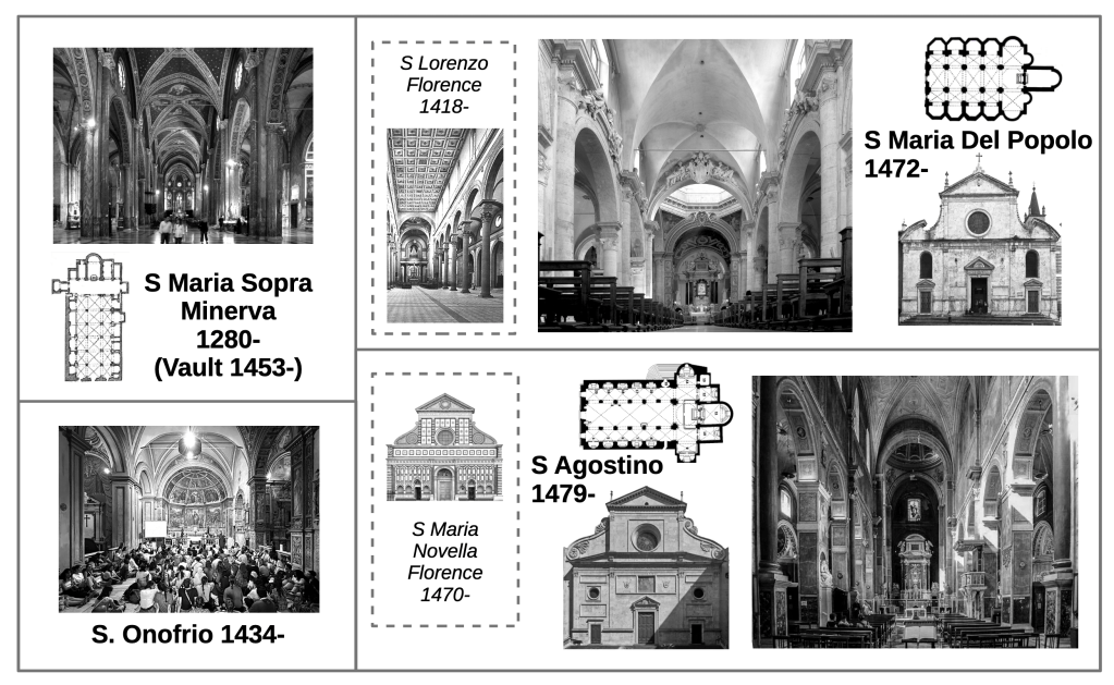 The earliest church in Rome built during the Renaissance, Sant’Onofrio al Gianicolo (1434-), still employed a medieval vaulted system but replaced side aisles with compartmentalized chapels—a popular late Gothic layout first introduced at the church of Santa Catalina in Barcelona (1243). Its proportions are unusually broad, and its interior is strongly unified, in contrast to the early Renaissance churches of Florence such as Brunelleschi’s San Lorenzo (1418-), whose modular bays consciously revive the early Christian basilican form and its compartmentalized character. Sant’Onofrio abandons Gothic detailing in favor of a restrained classical paneling scheme. The interior was later enriched with more elaborate decoration in 1588, yet the underlying structure preserves its transitional character between Gothic form and Renaissance classicism.